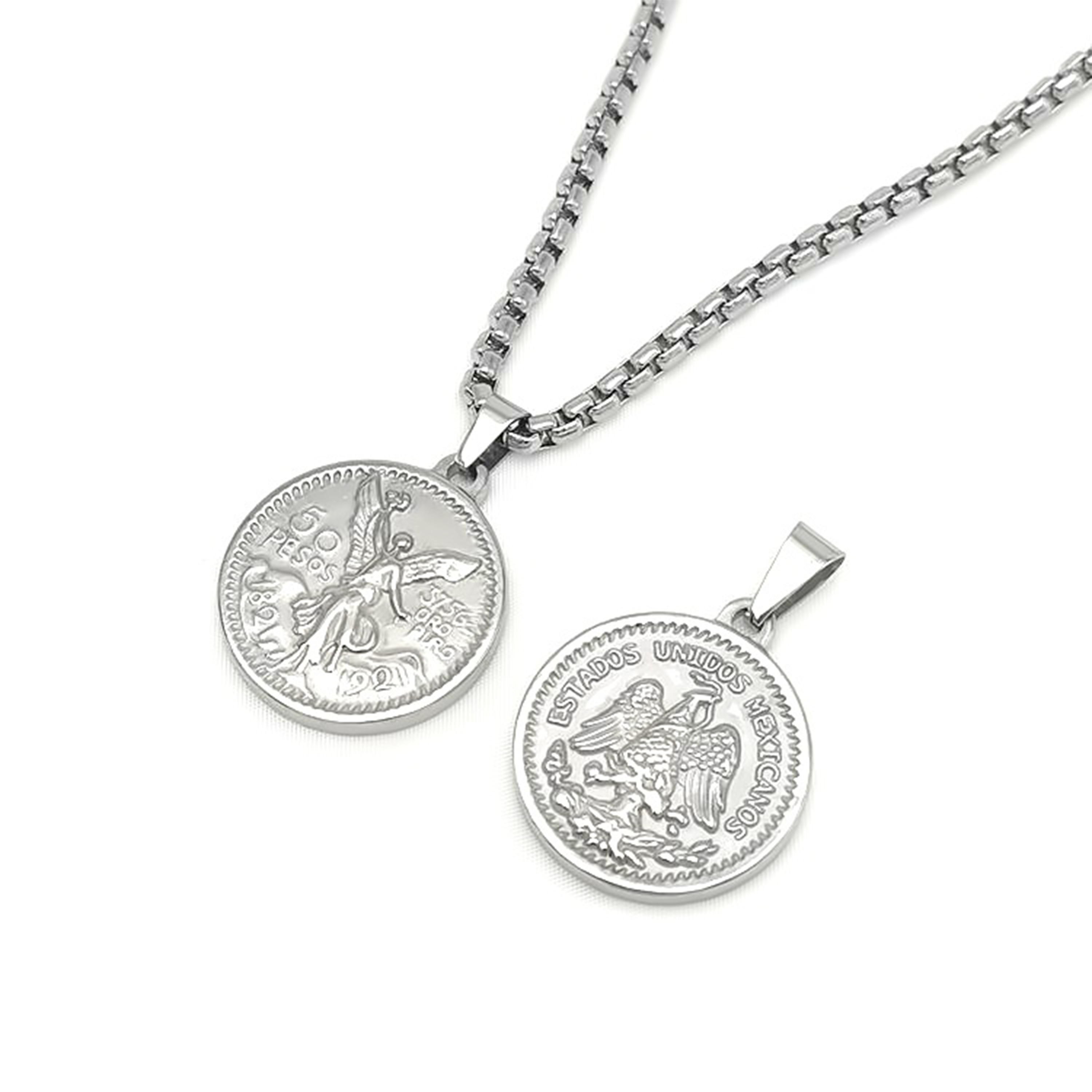 Der Anhänger zeigt eine mexikanische 50 Pesos Münze welche beidseitig tragbar ist.